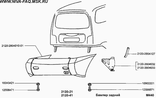 Мини-вэн "Надежда" (2120-21, 2120-41) - Бампер задний NIVA-FAQ Каталог запчастей Niva-FAQ Автор Бампер задний10902221Болт М6х16 12598471Шайба 8 стопорная 12599571Шайба 6 стопорная 16043421Болт М8х20 2120-2804010-01Бампер задний 2120-2804032Кронштейн бампера правый 2120-2804033Кронштейн бампера левый 2120-2804127Уплотнитель заднего бампера